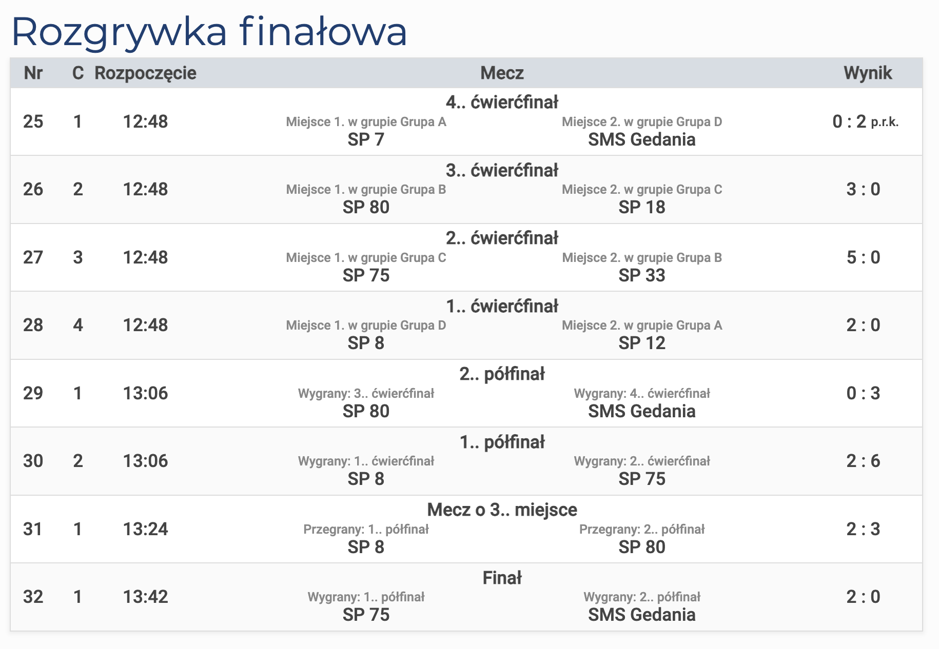 Z dwóch par półfinałowych do finału awansowały, Szkoła Podstawowa nr 75, której zawodnicy wygrywali w swoim spotkaniu 6-2 z uczniami Szkoły Podstawowej nr 8, oraz reprezentanci SMS Gedania 1922, którzy pokonali kolegów ze Szkoły Podstawowej nr 80 3-0.