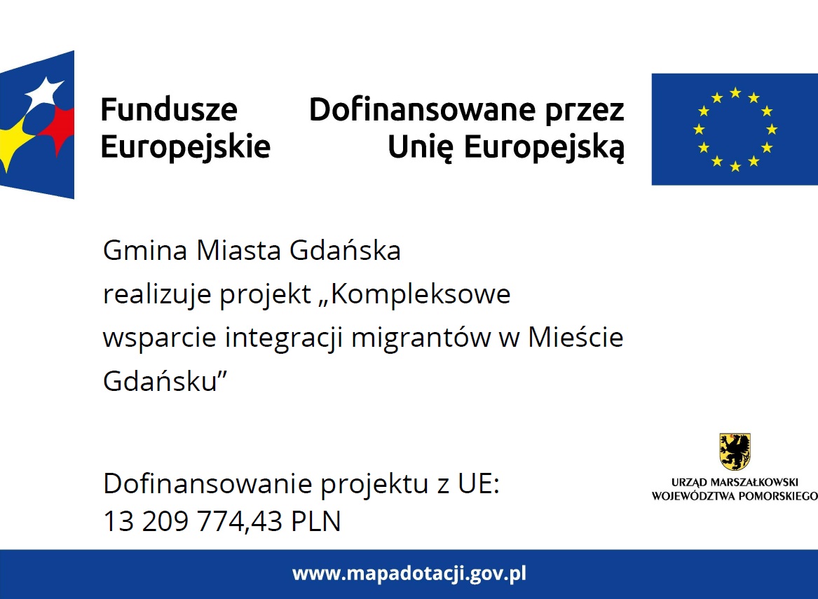 Projekt współfinansowany ze środków Europejskiego Funduszu Społecznego Plus (EFS+) w ramach Priorytetu 5 Fundusze europejskie dla silnego społecznie Pomorza (EFS+), Działania 5.15. Integracja migrantów – ZIT na terenie obszaru metropolitalnego.